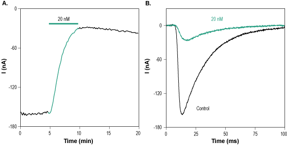 Alomone Labs µ-Conotoxin BuIIIC blocks NaV1.4 currents expressed in Xenopus oocytes.A. Time course of µ-Conotoxin BuIIIC (#STC-690) blocking action on NaV1.4 currents. Peak current amplitude was plotted as a function of time. Membrane potential was held at -100 mV and cells were stimulated by a 100 ms voltage step to -10 mV. 20 nM µ-Conotoxin BuIIIC were perfused as indicated by the bar (green) during 5 min. B. Superimposed examples of NaV1.4 channel current in the absence (control) and presence (green) of 20 nM µ-Conotoxin BuIIIC (taken from the experiment in A).