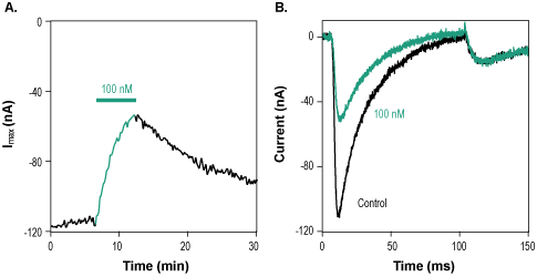 Alomone Labs µ-Conotoxin GIIIA blocks NaV1.4 currents in Xenopus oocytes.A. Time course of µ-Conotoxin GIIIA (#STC-280) action on maximum NaV1.4 current amplitude. Maximum peak current amplitudes were plotted as a function of time. Membrane potential was held at -100 mV and oocytes were stimulated by a 100 ms voltage step to 0 mV. 100 nM µ-Conotoxin-GIIIA was perfused as indicated by the bar (green) for 5 min. B. Superimposed examples of NaV1.4 channel peak current in the absence (control) and presence (green) of 100 nM µ-Conotoxin-GIIIA (taken from the experiment in A).