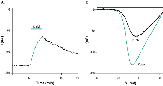 Alomone Labs μ-Conotoxin PIIIA inhibits NaV1.4 channel currents expressed in Xenopus oocytes.NaV1.4 currents were elicited by application of voltage ramp of 60 ms from holding potential of -100 mV to +40 mV. A. Time course of peak current amplitude before (black) and during (green) application of 20 nM μ-Conotoxin PIIIA (#STC-400) applied for 180 s. B. Superimposed example current traces before (black) and during (green) application of the toxin, taken from the experiment in A.