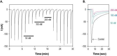 Alomone Labs α-Conotoxin PeIA inhibits α3/β2 nAChR heterologously expressed in Xenopus oocytes.A. Time course of α-Conotoxin PeIA (#STC-970) action on α3/β2 nAChR. Current amplitude were plotted as a function of time. Membrane potential was held at -80 mV and oocytes were stimulated by exposing them to 100 µM acetylcholine (Ach) every 100 sec. 50 nM (for 300 sec), 100 nM (for 300 sec) and 200 nM (for 200 sec) α-Conotoxin PeIA were perfused during the period marked by the bar. B. Superimposed traces of α3/β2 nAChR channel current in the absence (black) and presence of different concentrations of α-Conotoxin PeIA (taken from experiment in A).