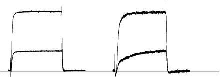 Alomone Labs β-Dendrotoxin inhibits cloned KV1.1 and KV1.2 channel currents heterologously expressed in Xenopus oocytes.KV1.1 (left, in 2 mM K+) and KV1.2 (right, in 5 mM K+) channel currents, elicited by 200 ms depolarization from holding potential of -100 mV to +20 mV, before and during application of 100 nM β-Dendrotoxin (#D-360). 62% (n = 4) of the KV1.1 and 74% (n = 4) of the KV1.2 channels were inhibited by 100 nM β-Dendrotoxin, respectively.