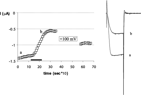 Alomone Labs ω-Grammotoxin SIA inhibits CaV2.2 channels heterologously expressed in Xenopus oocytes.Left: Time course showing current amplitude in response to 100 ms test pulse to 0 mV delivered every 10 seconds before, during (bar) and after application of 500 nM ω-Grammotoxin SIA (#G-450), which inhibits 60% of N-type currents. The box denoting +100 mV shows the period in which similar pulses to +100 mV were delivered in order to partially relieve the inhibition. Right: The current traces were taken at the indicated positions.