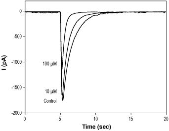 Alomone Labs 3-AQC blocks 5-HT3A channels expressed in HEK 293T cells.Currents were elicited by 10 µM 5-HT, delivered every 3 minutes. 3-AQC (#A-205) was applied 30 seconds before stimulation at 10 and 100 µM, as indicated, and inhibited the 5-HT induced current in a dose-dependent and reversible manner.