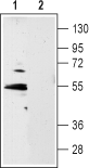 Western blot analysis of rat hippocampus lysate:1. Anti-5HT1B Receptor (HTR1B) (extracellular) Antibody (#ASR-022), (1:400).