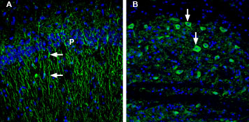 Expression of 5-Hydroxytryptamine receptor 1B in rat and mouse brainImmunohistochemical staining of rat and mouse brain sections using Anti-5HT1B Receptor (HTR1B) (extracellular) Antibody (#ASR-022), (1:200). A. 5-HT1B receptor staining (green) in rat hippocampal CA1 region is detected in the pyramidal layer (P) and apical dendrites (arrows). B. 5-HT1B receptor staining (green) in mouse deep cerebellar nucleus appears in neuronal profiles (arrows). DAPI counterstain is used for nuclei staining.