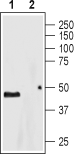 Western blot analysis of rat brain lysate:1. Anti-5HT4 Receptor (HTR4) (extracellular) Antibody (#ASR-036), (1:200).