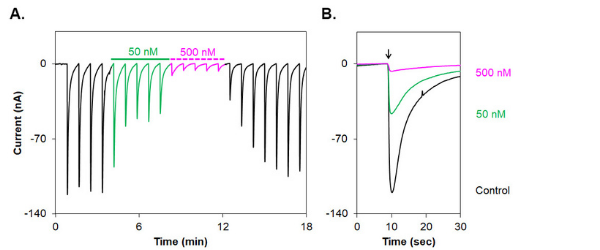 Alomone Labs Alpha-Conotoxin TxID inhibits α3/β4 nAChR heterologously expressed in Xenopus oocytes.A. Time course of Alpha-Conotoxin TxID (#STC-110) action on α3/β4 nAChR currents, elicited every 50 sec by a transient application of 20 µM ACh, while membrane potential was held at -80 mV. Application of 50 nM (green) and 500 nM (magenta) Alpha-Conotoxin TxID significantly inhibits the currents.