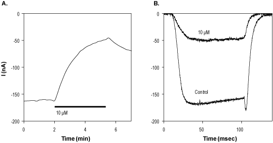 A. Time course of CaV1.2/α2-δ1/β2a (L-type) current inhibition by 10 µM Amlodipine (#A-110). Currents were elicited by application of voltage steps from a holding potential of -100 mV to 0 mV (100 msec). B. Superimposed example traces of current responses before and during perfusion of 10 µM Amlodipine as indicated.