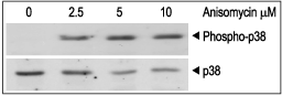 Alomone Labs Anisomycin induces p38 SAPK phosphorylation in C6 glioma cells.Cells were grown to 70% confluence, serum starved for 3 h, and then stimulated with various concentrations of Anisomycin (#A-520) for 60 min. Cell proteins were resolved by SDS-PAGE and probed with antiphospho-p38 MAPK (upper panel) or with anti-p38 (lower panel) antibodies.