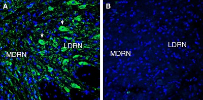 Expression of 5HT7 Receptor in rat dorsal raphe nucleus (DRN)Immunohistochemical staining of perfusion-fixed frozen rat brain sections with Anti-5HT7 Receptor/HTR7 (extracellular) Antibody (#ASR-037), (1:300), followed by goat anti-rabbit-AlexaFluor-488. A. 5HT7R immunoreactivity (green) appears in neuronal profiles in the lateral DRN (arrows). B. Pre-incubation of the antibody with 5HT7 Receptor/HTR7 (extracellular) Blocking Peptide (#BLP-SR037), suppresses staining. Cell nuclei are stained with DAPI (blue). LDRN = lateral DRN, MDRN = medial DRN.