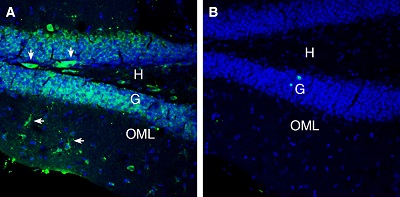 Expression of 5HT7 Receptor in mouse hippocampusImmunohistochemical staining of perfusion-fixed frozen mouse brain sections with Anti-5HT7 Receptor/HTR7 (extracellular) Antibody (#ASR-037), (1:300), followed by goat anti-rabbit-AlexaFluor-488. A. Staining in the hippocampal dentate gyrus region, shows 5HT7R immunoreactivity (green) in neuronal profiles in the hilus (vertical arrows) and in glial profiles in the outer molecular layer (OML, horizontal arrows). B. Pre-incubation of the antibody with 5HT7 Receptor/HTR7 (extracellular) Blocking Peptide (#BLP-SR037), suppressed staining. Cell nuclei are stained with DAPI (blue). H = hilus, G = granule layer, OML= outer molecular layer.