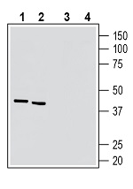 Western blot analysis of rat brain lysate (lanes 1 and 3) and mouse brain lysate (lanes 2 and 4):1, 2. Anti-5HT7 Receptor/HTR7 (extracellular) Antibody (#ASR-037), (1:400).
