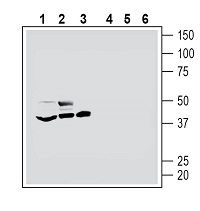 Western blot analysis of mouse BV-2 microglia cell line lysate (lanes 1 and 4), human THP-1 monocytic leukemia cell line lysate (lanes 2 and 5) and human MEG-01 megakaryoblastic leukemia cell line lysate (lanes 3 and 6):1-3. Anti-5HT7 Receptor/HTR7 (extracellular) Antibody (#ASR-037), (1:400).