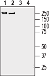 Western blot analysis of rat brain membranes (lanes 1 and 3) and mouse brain lysate (lanes 2 and 4):1,2. Anti-AKAP12 Antibody (#APZ-033), (1:200).