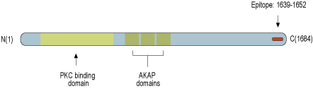 - Peptide (C)GNLTKESPDTNGPK, corresponding to amino acid residues 1639-1652 of mouse AKAP12 (Accession Q9WTQ5). Intracellular, C-terminus.