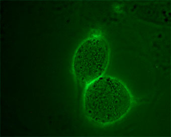 Expression of Angiotensin II receptor type-2 in mouse 3T3-L1 cellsCell surface detection of Angiotensin II receptor type-2 in intact live mouse 3T3-L1 cells with Anti-Angiotensin II Receptor Type-2 (extracellular)-ATTO Fluor-488 Antibody (#AAR-012-AG), (1:50), (green). Live view of the same field was superimposed to the fluorescent one.