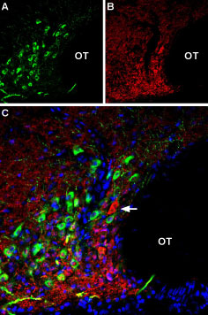 Multiplex staining of AT2 receptor and VGLUT2 in rat supraoptic hypothalamic nucleusImmunohistochemical staining of perfusion-fixed frozen rat brain sections using Anti-Angiotensin II Receptor Type-2 (extracellular)-ATTO Fluor-488 Antibody (#AAR-012-AG), (1:60) and Anti-VGLUT2-ATTO Fluor-594 Antibody (#AGC-036-AR), (1:60). A. AT2 receptor staining (green). B. VGLUT2 staining (red). C. Merge of the two images shows a general lack of co-localization of AT2R and VGLUT2 in this part of the hypothalamus (arrow). Cell nuclei are stained with DAPI (blue).