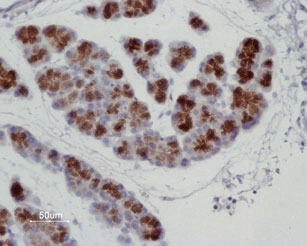 Expression of AQP8 in rat pancreasImmunohistochemical staining of rat pancreas paraffin-embedded sections using Anti-Aquaporin 8 Antibody (#AQP-008), (1:100). Staining (brown) is specific for the apical portion of acinar cells in the exocrine pancreas. Hematoxilin is used as the counterstain.