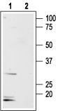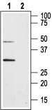 Western blot analysis of rat small intestine membranes:1. Anti-Aquaporin 8 Antibody (#AQP-008), (1:200).