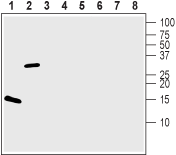 Western blot analysis of 100 ng of each Recombinant human BDNF protein (#B-250) (lanes 1 and 5), Recombinant mouse proBDNF protein (#B-240) (lanes 2 and 6), Recombinant human Neurotrophin-3 (NT-3) protein (#N-260) (lanes 3 and 7) and Recombinant human beta-NGF protein (#N-245) (lanes 4 and 8):1-4. Guinea pig Anti-BDNF Antibody (#ANT-010-GP), (1:500).