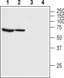 Western blot analysis of rat lung (lanes 1 and 3) and rat eye (lanes 2 and 4) lysate:1,2. Anti-Bestrophin-1 (extracellular) Antibody (#ABC-001), (1:200).