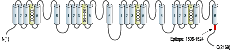 - Peptide (C)DNFDYLTRDWSILGPHHLD, corresponding to amino acid residues 1506-1524 of rat CaV1.2 (Accession P22002). Intracellular, C-terminus region.
