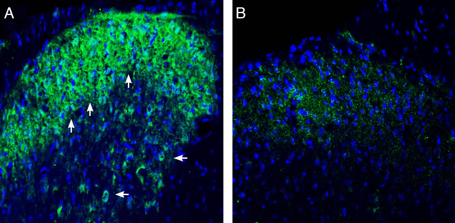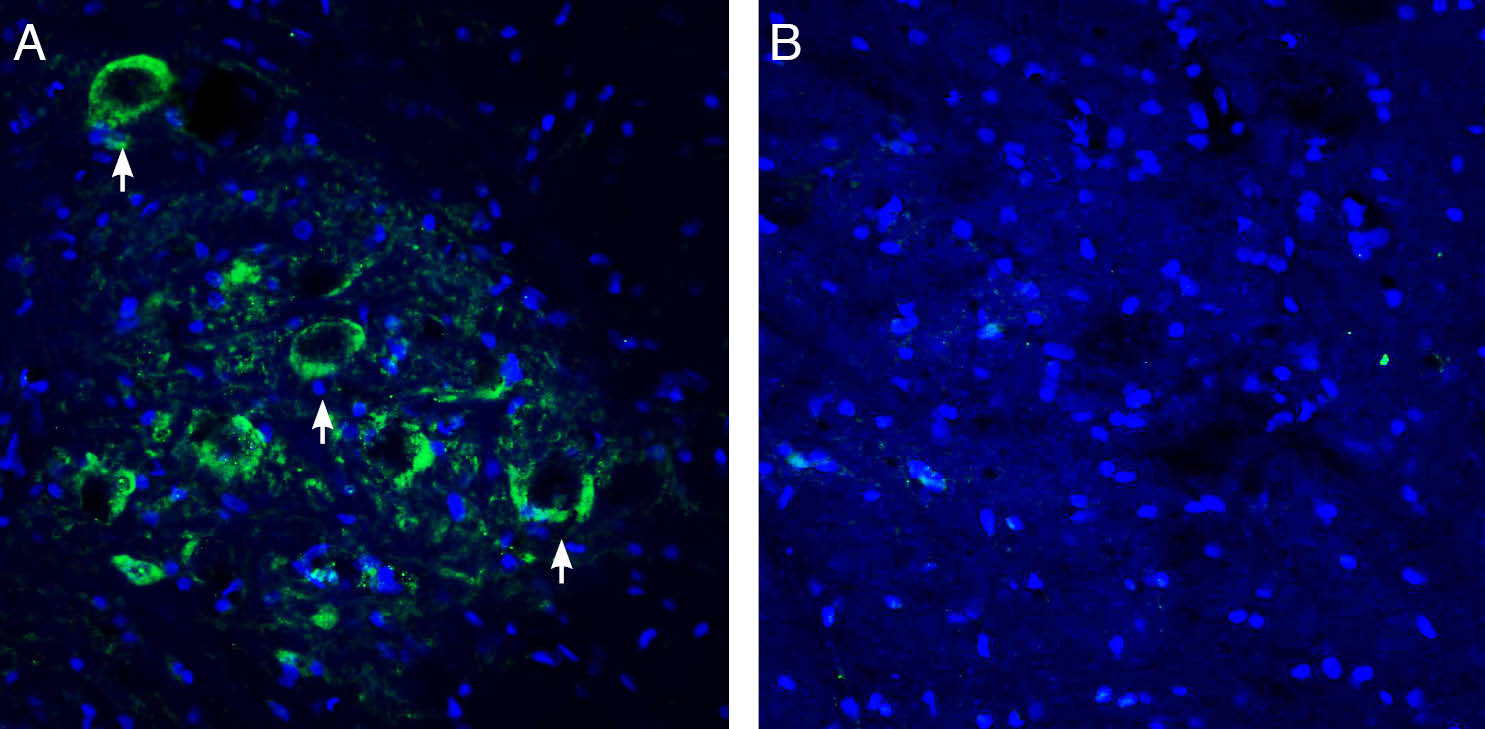 Expression of Connexin-47 in rat spinal cord ventral horn region.Immunohistochemical staining of perfusion-fixed frozen rat spinal cord sections with Anti-Connexin-47 (GJC2) Antibody (#ACC-222), (1:300), followed by goat anti-rabbit-AlexaFluor-488. A. Staining in the ventral horn region showed CX-47 immunoreactivity (green) in neuron profiles (arrows). B. Pre-incubation of the antibody with Connexin-47 (GJC2) Blocking Peptide (BLP-CC222), suppressed staining. Cell nuclei are stained with DAPI (blue).