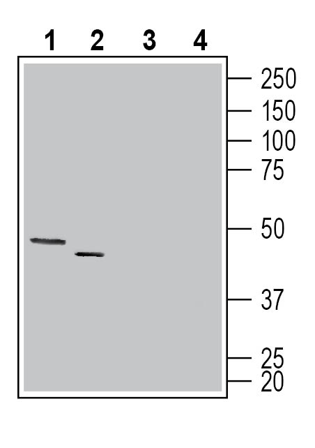 Western blot analysis of rat brain membranes (lanes 1 and 3) and mouse brain membranes (lanes 2 and 4):1-2. Anti-Connexin-47 (GJC2) Antibody (#ACC-222), (1:200).