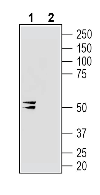 Western blot analysis of human U-87 MG glioblastoma cell line lysate:1. Anti-Connexin-47 (GJC2) Antibody (#ACC-222), (1:200).
