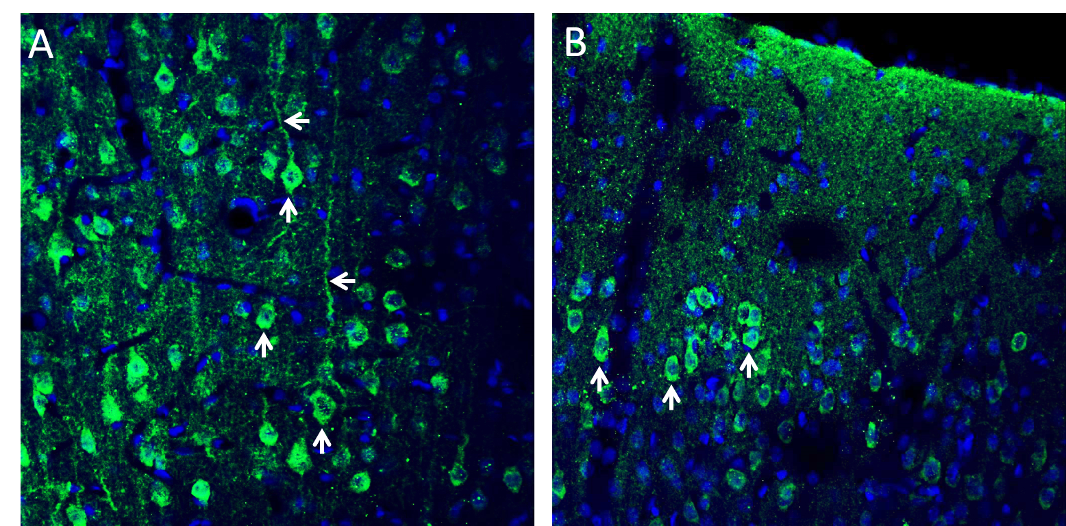 Expression of CX3CL1 in rat frontal cortexImmunohistochemical staining of perfusion-fixed frozen rat brain sections with Anti-CX3CL1 (extracellular) Antibody (#ACR-057), (1:200), followed by goat anti-rabbit-AlexaFluor-488. A. CX3CL1 staining (green) in the deep layer of the frontal cortex is detected in cortical neurons (vertical arrows) and their dendrites (horizontal arrows). B. CX3CL1 immunoreactivity (green) in the upper layer of the frontal cortex is observed in cortical neurons (vertical arrows). Cell nuclei are stained with DAPI (blue).