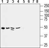 Western blot analysis of rat heart membrane (lanes 1 and 5), human pancreatic carcinoma PANC-1 lysate (lanes 2 and 6), mouse heart membrane (lanes 3 and 7) and rat brain synaptosomal fraction (lanes 4 and 8):1-4. Anti-CX3CL1 (extracellular) Antibody (#ACR-057), (1:400).