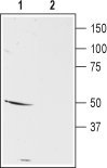 Western blot analysis of mouse brain membranes:1. Anti-D5 Dopamine Receptor (extracellular) Antibody (#ADR-005), (1:200).