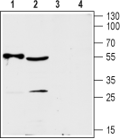 Western blot analysis of rat heart (lanes 1 and 3) and mouse brain (lanes 2 and 4) lysates:1,2. Anti-ENT2 (SLC29A2) Antibody (#ANT-052), (1:200).