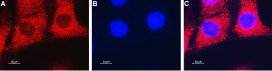 Expression of ENT2 in mouse C2C12 myoblast cellsImmunocytochemical staining of fixed and permeabilized mouse C2C12 myoblast cells. A. Cells were stained with Anti-ENT2 (SLC29A2) Antibody (#ANT-052), (1:500), followed by goat anti-rabbit-AlexaFluor-594 secondary antibody (red). B. Cell nuclei were visualized using Hoechst 33342 (blue). C. Merge of the two images.