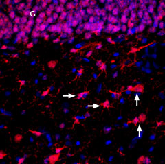Expression of ENT2 in rat hippocampusImmunohistochemical staining of perfusion-fixed frozen rat brain sections with Anti-ENT2 (SLC29A2) Antibody (#ANT-052), (1:300), followed by donkey anti-rabbit-biotin and streptatividin-Cy3. ENT2 staining (red) in the rat hippocampal dentate gyrus is detected in the granule layer (G), in hilar neurons (vertical arrows) and astrocytes (horizontal arrows). Cell nuclei are stained with DAPI (blue).