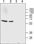 Western blot analysis of rat (lanes 1 and 3) and mouse (lanes 2 and 4) brain lysates:1,2. Anti-GABA Transporter 1 (GAT-1) (extracellular) Antibody (#AGT-001), (1:200).