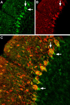 Expression of GABATR in rat cerebellumImmunohistochemical staining of rat cerebellum using Anti-GABA Transporter 1 (GAT-1) (extracellular) Antibody (#AGT-001), (1:200). A. GAT-1 staining is shown in green. B. Neurons expressing gamma amino butyric acid (GABA) were labeled with mouse Anti-parvalbumin (red). C. Merge of the two images demonstrates partial colocalization (arrows). GAT-1 appears both in the soma of Purkinje cells (vertical arrows) and in the pinceau (horizontal arrows).