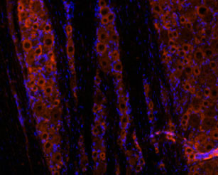 Expression of GDNF in rat dorsal root ganglion (DRG).Immunohistochemical staining of rat DRG longitudinal frozen section using Anti-GDNF Antibody (#ANT-014), (1:50), followed by Alexa 555-conjugated goat anti-rabbit antibody (red). Hoechst 33342 (blue) was used as a counterstain. GDNF staining is specific for neurons. Note that Schwann cells as well as satellite glial cells are both negative.