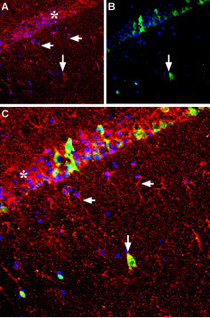 Expression of GDNF in rat hippocampusImmunohistochemical staining of rat hippocampus frozen sections with Anti-GDNF Antibody (#ANT-014), (1:100), (red). A. GDNF staining is apparent in the pyramidal layer (asterik), in astrocytic fibers (horizontal arrows) and in some interneurons (vertical arrow). B. Calbindin D28k (green) appears in a subset of cells in the pyramidal layer. C. Merge of GDNF and calbindin demonstrates some co-localization in neurons. DAPI is used as the counterstain (blue).