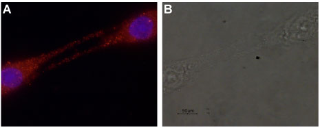 Expression of GDNF in rat C6 glioma cellsImmunocytochemical staining of GDNF in rat C6 glioma cells. A. Paraformaldehyde-fixed and permeabilized rat C6 glioma cells were stained with Anti-GDNF Antibody (#ANT-014), (1:200) followed by goat anti-rabbit-AlexaFluor-555 secondary antibody (red). Nuclei were visualized with the cell-permeable dye Hoechst 33342 (blue). B. Live view of the same field as in (A).