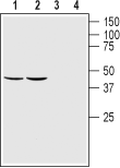 Western blot analysis of rat (lanes 1 and 3) and mouse (lanes 2 and 4) brain lysates:1,2. Anti-GFR alpha 1 (extracellular) Antibody (#ANT-021), (1:200).