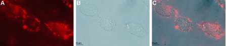 Expression of GFRA1 in live intact rat C6 glioma cellsCell surface detection of GFRA1 in live intact rat C6 glioma cells with Anti-GFR alpha 1 (extracellular) Antibody (#ANT-021), (1:50), followed by goat-anti-rabbit-DyLight-594 secondary antibody (red) (A). B. Live view of the cells. C. Merge of the two images.
