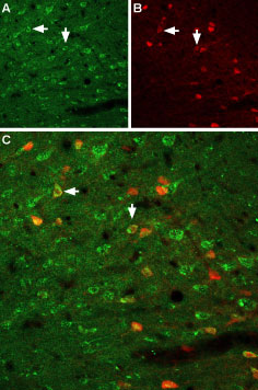 Expression of GFRA1 in rat neocortexImmunohistochemical staining of immersion-fixed, free floating rat brain frozen sections using Anti-GFR alpha 1 (extracellular) Antibody (#ANT-021), (1:100). A. GFRA1 (green) is visualized in neocortex neurons. B. Neurons expressing γ-amino butyric acid (GABA) are labeled with parvalbumin (red). C. Merge of the two images demonstrates partial colocalization (arrows).