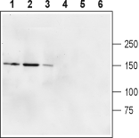 Western blot analysis of rat brain membranes (lanes 1 and 4), mouse brain membranes (lanes 2 and 5) and human U87-MG glioblastoma cell lysate (lines 3 and 6):1-3. Anti-GRID2 (extracellular) Antibody (#AGC-039), (1:600).