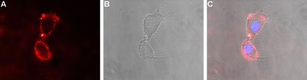 Expression of Glutamate receptor δ2 in rat PC12 cellsCell surface detection of GluD2 in live intact rat PC12 pheochromocytoma cells. A. Extracellular staining of cells with Anti-GRID2 (extracellular) Antibody (#AGC-039), (1:50), followed by goat anti-rabbit-AlexaFluor-594 secondary antibody (red). B. Live view of the cells. C. Merge of A and B. Cell nuclei (blue) were visualized with Hoechst 33342.