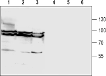 Western blot analysis of rat brain (lanes 1 and 4), mouse brain (lanes 2 and 5) and human U87-MG glioma cell (lanes 3 and 6) lysates:1-3. Anti-GlyT1 (SLC6A9) (extracellular) Antibody (#AGT-011), (1:200).