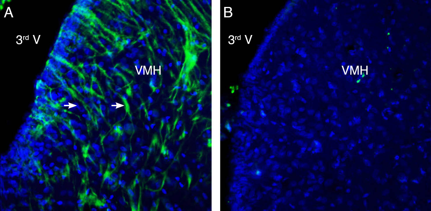 Expression of GPR139 in rat ventromedial hypothalamus (VMH).Immunohistochemical staining of perfusion-fixed frozen rat brain sections with Anti-GPR139 Antibody (#AGR-069), (1:600), followed by goat anti-rabbit-AlexaFluor-488. A. GPR139 immunoreactivity (green) appears in tanycyte-like processes (arrows). B. Pre-incubation of the antibody with GPR139 Blocking Peptide (BLP-GR069), suppressed staining. Cell nuclei are stained with DAPI (blue). 3rd V = third ventricle.