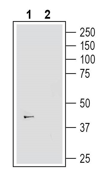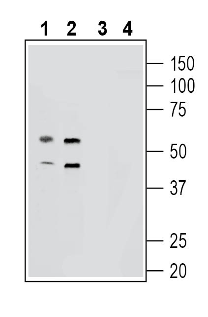 Western blot analysis of mouse brain membranes (lanes 1 and 3) and rat brain lysates (lanes 2 and 4):1-2. Anti-GPR139 Antibody (#AGR-069), (1:800).