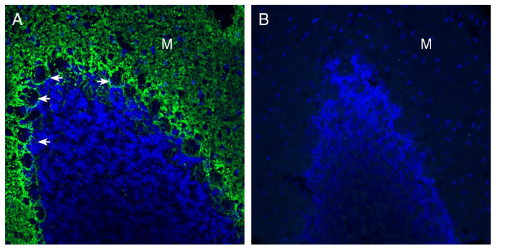 Expression of GPR37L1 in rat cerebellum.Immunohistochemical staining of perfusion-fixed frozen rat brain sections with Anti-GPR37L1 (extracellular) Antibody (#AGR-050), (1:300), followed by goat anti-rabbit-AlexaFluor-488. A. GPR37L1 immunoreactivity (green) appeared around Purkinje cell soma (arrows) and in the molecular layer (M). B. Pre-incubation of the antibody with GPR37L1 (extracellular) Blocking Peptide (BLP-GR050), suppressed staining. Cell nuclei are stained with DAPI (blue).