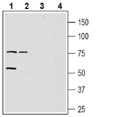 Western blot analysis of mouse brain membranes (lanes 1 and 3) and rat brain membranes (lanes 2 and 4):1-2. Anti-GPR37L1 (extracellular) Antibody (#AGR-050), (1:200). 3-4. Anti-GPR37L1 (extracellular) Antibody, preincubated with GPR37L1 (extracellular) Blocking Peptide (BLP-GR050).